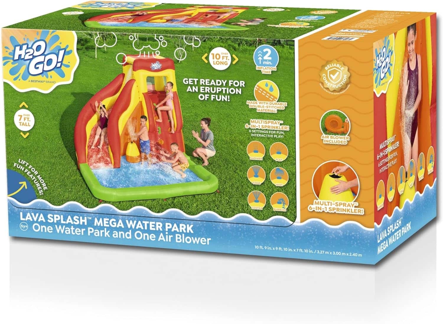 Con el Parque Acuático Inflable de volcanes los niños vivirán una experiencia explosiva en su propio patio. La estructura cuenta con un volcán temático llamado Mount Fun-suvius, que invita a los pequeños a escalar hasta la cima y deslizarse rápidamente por el súper resbaladero, mientras se refrescan con el rociador incorporado. La gran piscina en la base está lista para recibirlos con un chapuzón, y el MultiSpray gigante añade diversión extra con seis patrones de agua ajustables, ideal para mantener a los niños frescos y entretenidos.